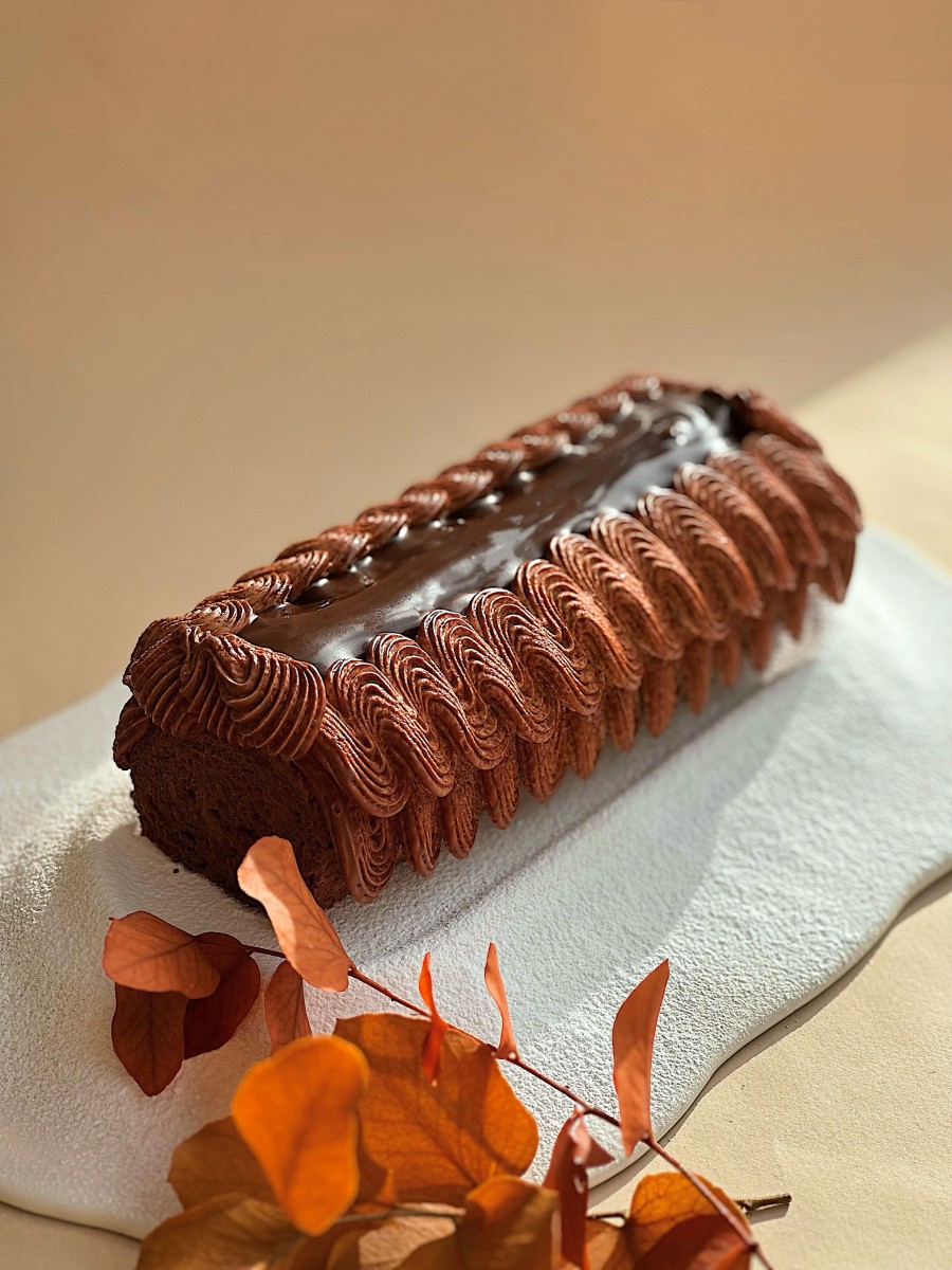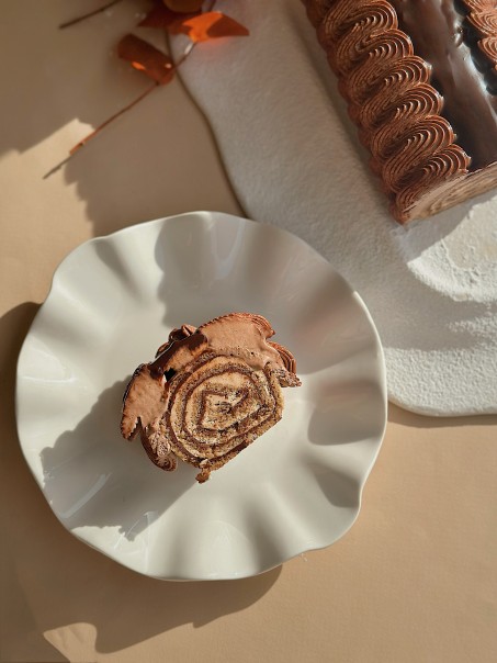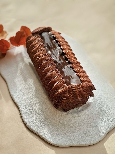 Biscuit Joconde imbibé au café, ganache chocolat noir, crémeux miso blanc/rouge et café, pâte de cacahuète, ganache montée chocolat noir, caramel cacaoté