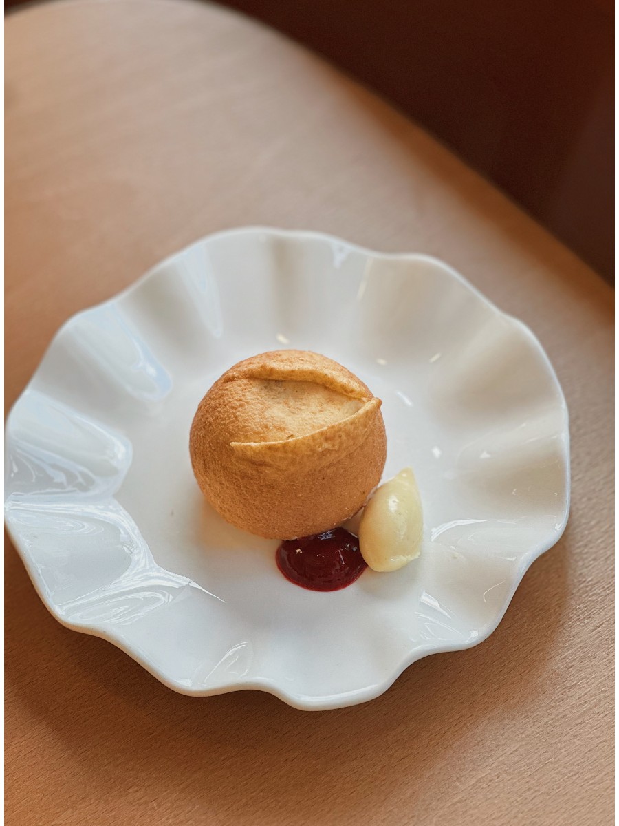 Biscuit kinako (soja torréfié), croustillant riz soufflé, praliné graines de tournesol-sobacha-pain grillé, crémeux praliné, ganache montée au pain grillé, coulis framboise, ganache miso